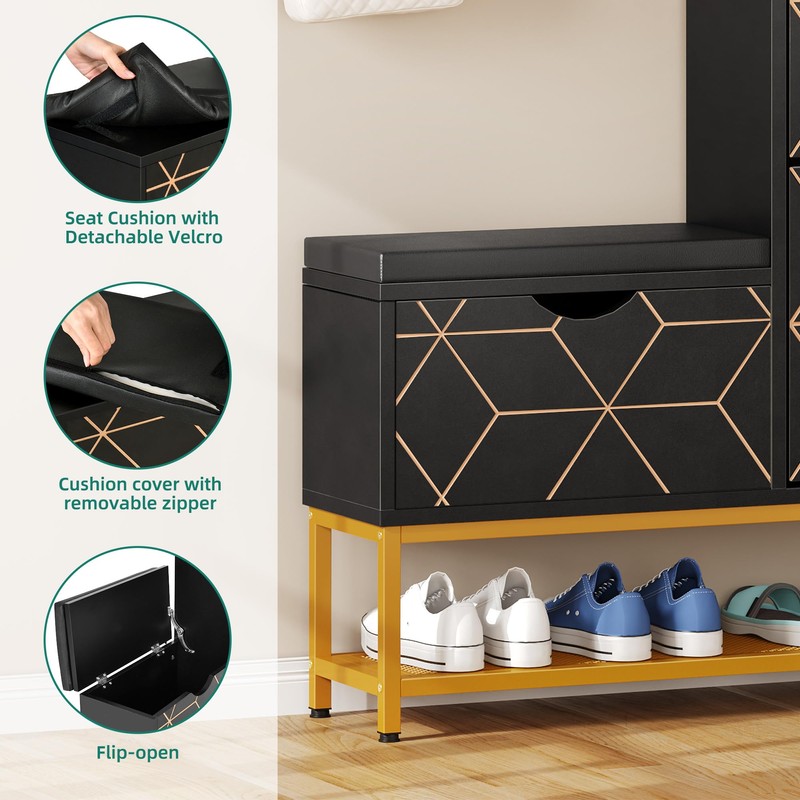 - Comfy Bench with Flip-Open Storage: Sit on our cushy padded shoe stool while you change shoes. No need to bend or squat awkwardly. Plus, the hidden storage space is great for stowing away umbrellas, books, and more, making your entryway feel organized