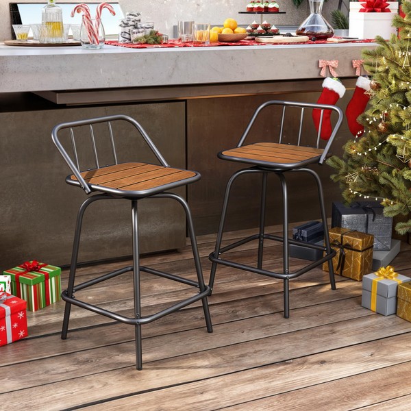 YITAHOME Outdoor Bar Stools Set of 2 Swivel Barstools, 24" Bar Height Outdoor Chairs with Back and Footrest, All-Weather 360 Rotating Patio Bar Stools for Bar, Kitchen Island, Wood