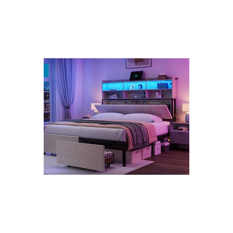 - Soft Comfort & Solid Build: The queen size bed frame with storage is wrapped in soft, gentle-on-the skin linen & sponge material, giving you a soothing touch every time you lean back. With sturdy metal slats for 1102 lbs load capacity, the frame offers stability for your restful nights