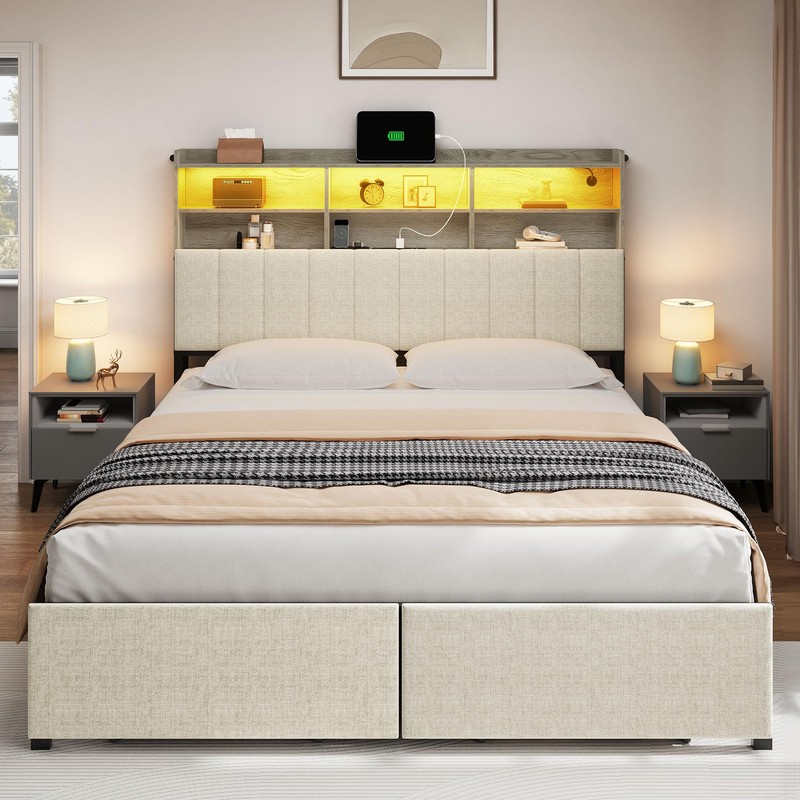 YITAHOME Queen Bed Frame with 2-Tier Storage Shelves and Bookcase Headboard,LED Light Queen Size Bed with Charging Station, No Box Spring Needed/Noise Free, Beige