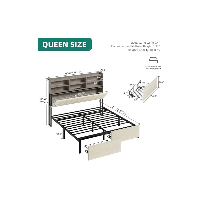 - Large-Capacity 2-tier Storage Bookcase Headboard: You'll have all your books, gadgets, and essentials neatly within reach. No more scrambling around, everything you need is right there, ready to grab as you relax. This queen bed frame with headboard and storage is so practical