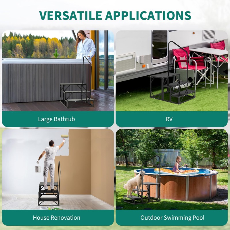 - Robust & Durable: Crafted from heavy-duty alloy steel with a sleek black powder-coated finish, these outdoor hot tub stairs offer durability, strength, and easy maintenance; Capable of holding up to 500 pounds for added convenience and functionality