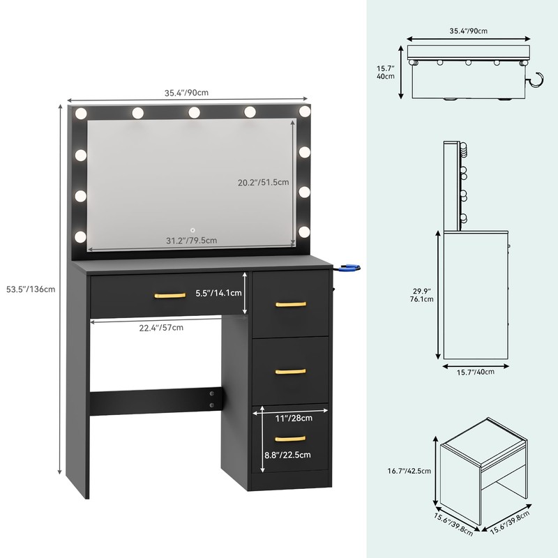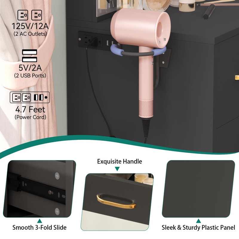 - Built-in Power Hub: Our vanity table features 2 AC outlets, 1 USB and 1 Type-C port, suitable for powering hair tools or charging your phone. A built-in hair dryer rack keeps your essentials neatly organized and within reach