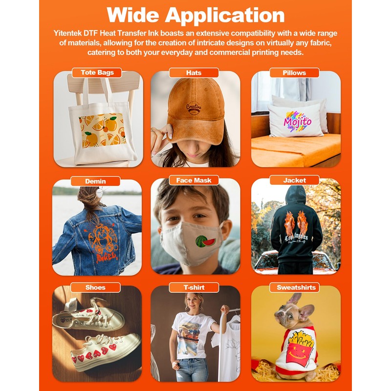 - ✅ 【BOOST YOUR BUSINESS】 Designed for high efficiency, Yitentek DTF ink undergoes rigorous quality testing to ensure low ink consumption and stable performance during high-speed printing, allowing for extended continuous printing. Whether you’re customizing unique t-shirts for holidays like Christmas, Thanksgiving, Valentine's Day, Halloween, or New Year, our ink helps you create stunning designs that are perfect gifts for family and friends.