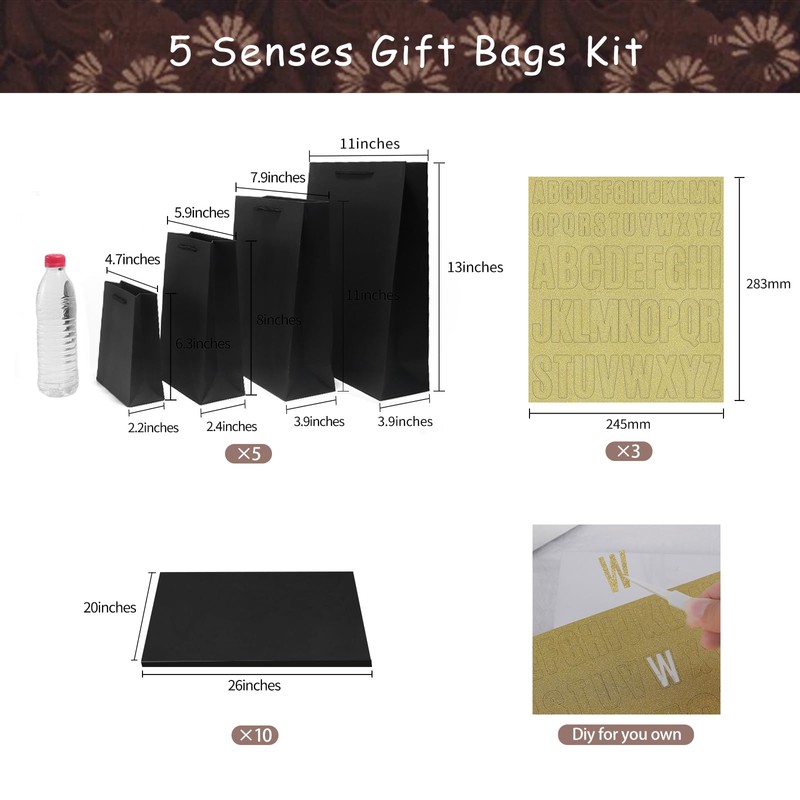 - El paquete incluye: Este kit de 5 bolsas de regalo incluye 5 bolsas de regalo, 10 piezas de papel de seda, 1 pancarta de globo "Happy Birthday", 30 globos metálicos, 1.000 piezas de pétalos de rosa y 3 hojas de calcomanías de letras. Cada bolsa se puede decorar por tu cuenta con calcomanías de letras con purpurina con letras inglesas [gusto], [tacto], [olor], [sonido] y [vista]; puede ser una buena manera de crear un regalo de 5 sentidos para tu ser querido, todo lo que necesitas añadir son los regalos en sí mismos
