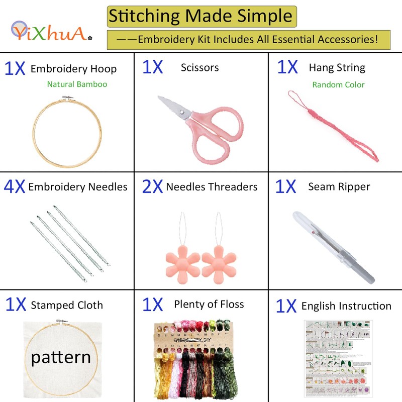 All-Inclusive Kit:Ultimate embroidery package contains all essential supplies – 1 bamboo hoop(7.8in),1 Pre-Printed embroidery cloths (12x12in),1 detailed instructions,1 color thread sets(30% more),4 needles,2 needle threader,1 seam ripper,1 scissors and 1 hang string.We care about every detail you care about.