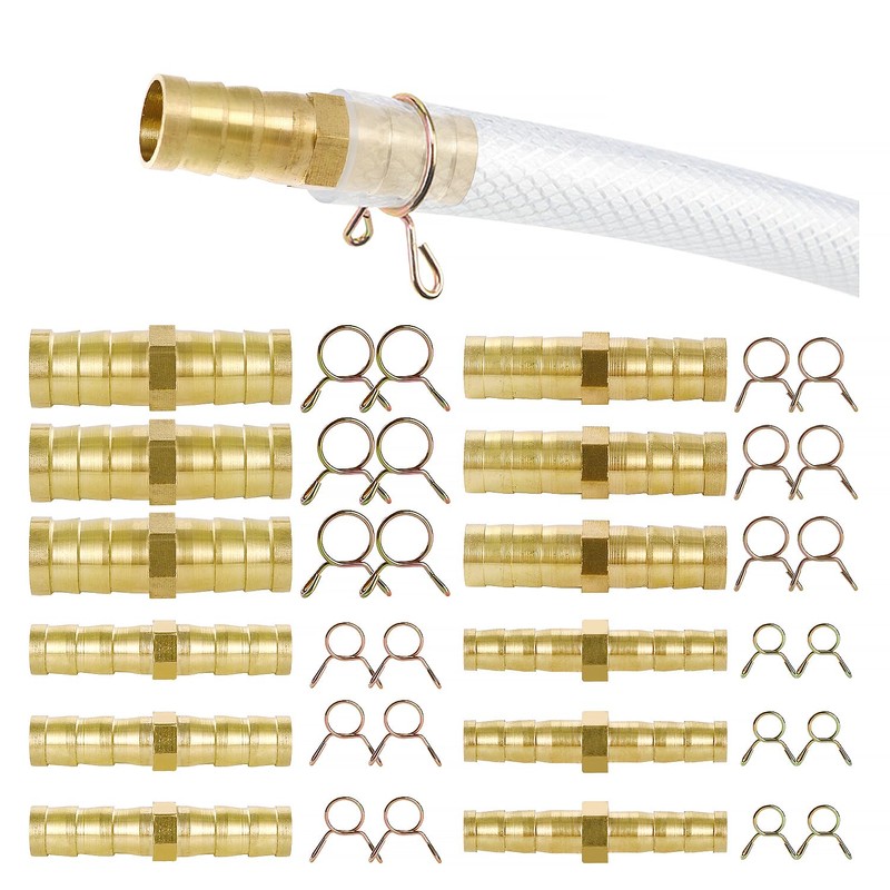 YIXISI 12 PCS 6/8/10/12 mm 2-Way Fuel Hose Barbed Connector, Brass Joiner Hose Joiner Adapter, Fuel Hose Connector, with 24 PCS Hose Clamps, for Fuel Air, Water, Air, Gas Oil