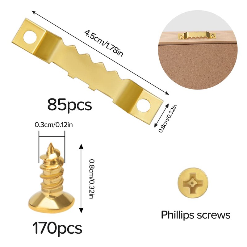 YIXISI 85 Pieces Sawtooth Picture Hangers + 170 Pieces Screws, Double Hole Picture Frame Hangers, Sawtooth Picture Frame Holder for Stretcher Frame, Picture Frame Hanger, Golden (45 x 8 mm)