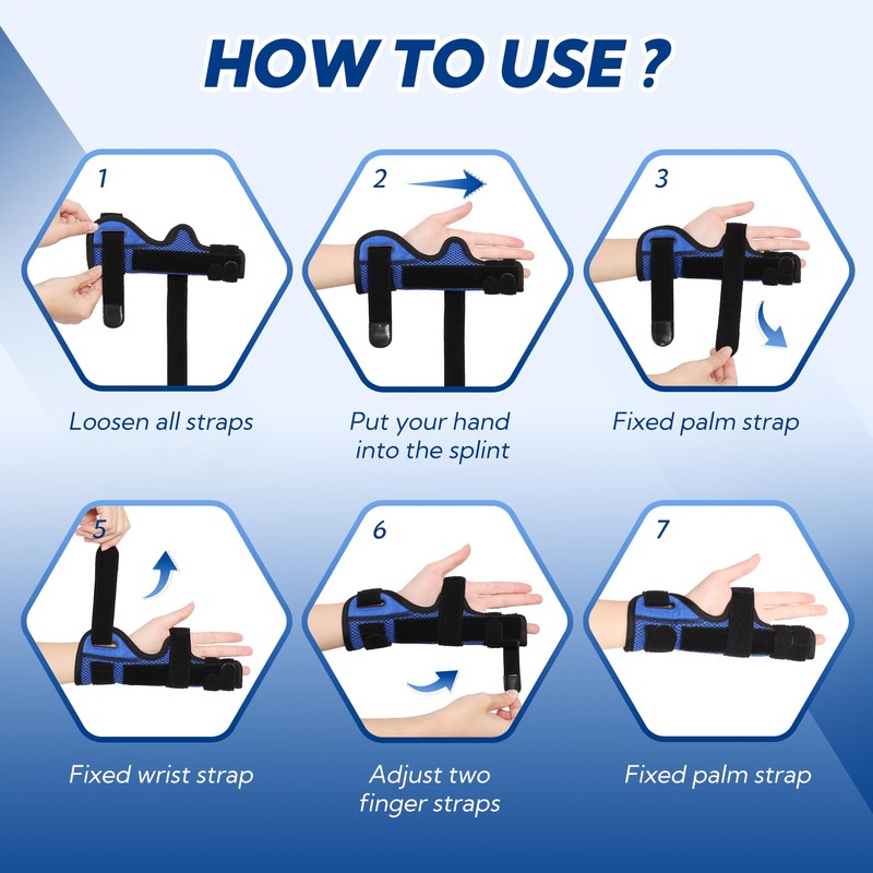 • Quick Adjustment The finger splints for broken fingers are equipped with durable hooks and loops for long lasting use. You can easily tighten or loosen the splint as it is comfortable for you. It can be quickly put on with one hand.