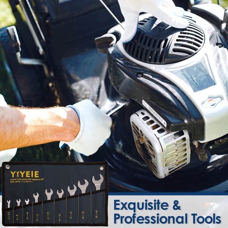 YIYEIE 9Pc. Super-Thin Open End Wrench Set, Metric 5.5, 7, 8, 9, 10, 11, 12, 13, 14, 15, 16, 17, 19, 21, 22, 23, 24, 27 mm, CR-V Steel, Ultra-Slim Flat Wrench Set with Roll-up Pouch
