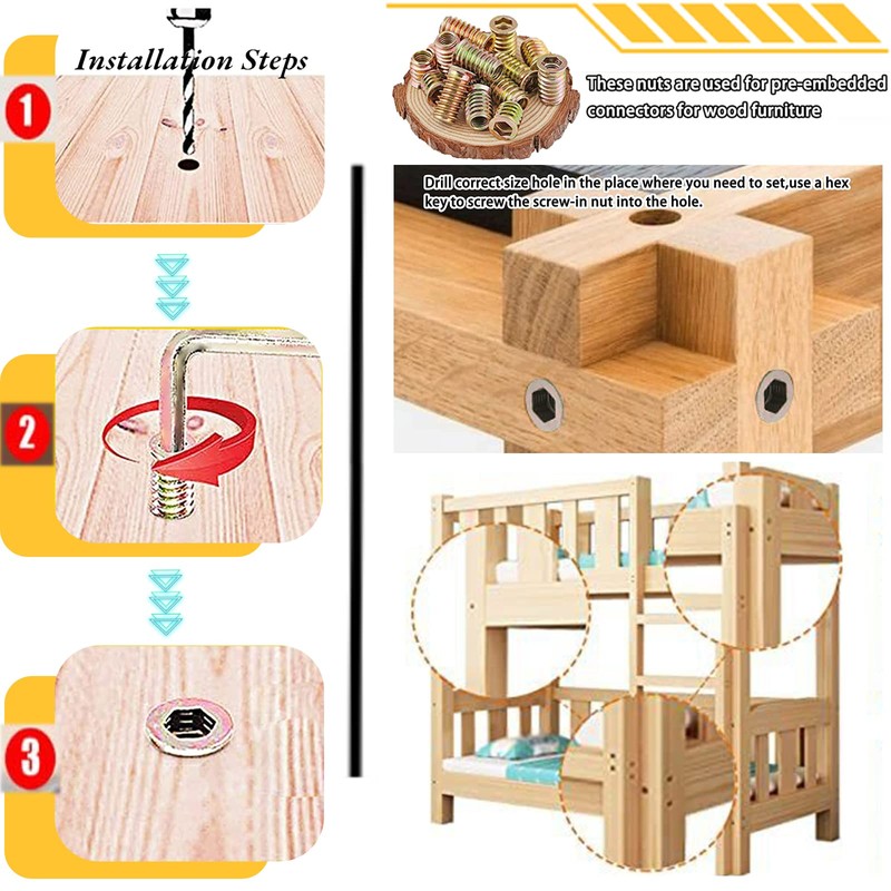 • Wide applications: furniture threaded insert nuts are ideal for professionals, amateurs, landlords, craftsmen, repairmen, women, woodworking, construction, plumbing, HVAC and so on. Not only suitable for hardwood, pine, plywood, fiberboard, have a good effect in the advanced furniture combination, but also use on sheet metal and printed projects.