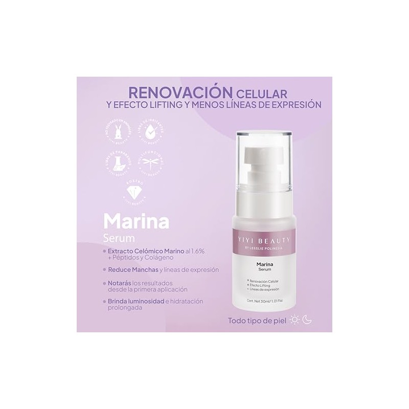 Marina Suero facial concentrado de activos con Extracto Celómico Marino, Colágeno y Péptidos que ayudan a prevenir y hacer menos evidentes los signos de la edad en la piel. Su fórmula ayuda a la reparación, renovación y regeneración celular, así como la producción de Colágeno y Elastina. ¡Notarás los resultados desde la primera aplicación! BENEFICIOS Renovación Celular, efecto lifting y menos líneas de expresión. Reduce manchas y líneas de expresión luciendo una apariencia más juvenil. Tono más uniforme mejorando el aspecto de tu piel. Brinda luminosidad e hidratación prolongada. INGREDIENTES ACTIVOS Extracto Celómico Marino al 1.6%, Argirelina, Péptidos, Alga Arcoiris, Colágeno y Vitamina E El Extracto Celómico Marino ayuda a la regeneración celular y brinda firmeza a la piel. La Argirelina es un Péptido natural que mejora el aspecto de las líneas de expresión, brindando un efecto lifting en la piel. IDEAL PARA Combatir los signos de la edad Disminuir y prevenir líneas de expresión Para todo tipo de piel MODO DE USO: Aplica tu Serum Marina de YIYI BEAUTY ® sobre tu rostro y cuello limpios, masajea con movimientos circulares hasta que el suero se absorba por completo. Posteriormente, continúa con tu rutina de skincare agregando tu crema facial y finalmente, aplica tu protector solar habitual. Para mejores resultados puedes mezclar varios sueros de YIYI BEAUTY ® con tus productos skincare y potenciar sus beneficios SELLOS Libre de Crueldad Animal Libre de irritantes Libre de parabenos Descubre el poder de ser tú misma y deja que tu piel brille con los sueros de YIYI Beauty. ¡Tu belleza, sin filtros! Consulta tu dermatólogo para mejores resultados.