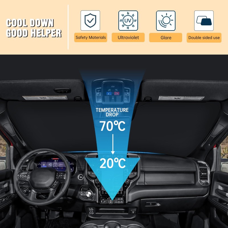 - 【High Quality】The Dodge RAM windshield sunshade is made of double-layer insulation fabric, including a black thermal insulation layer and a silver reflective layer, which forms dual protection and can effectively block 99% of the sun and ultraviolet rays, making the car cooler and ensuring comfort when driving.