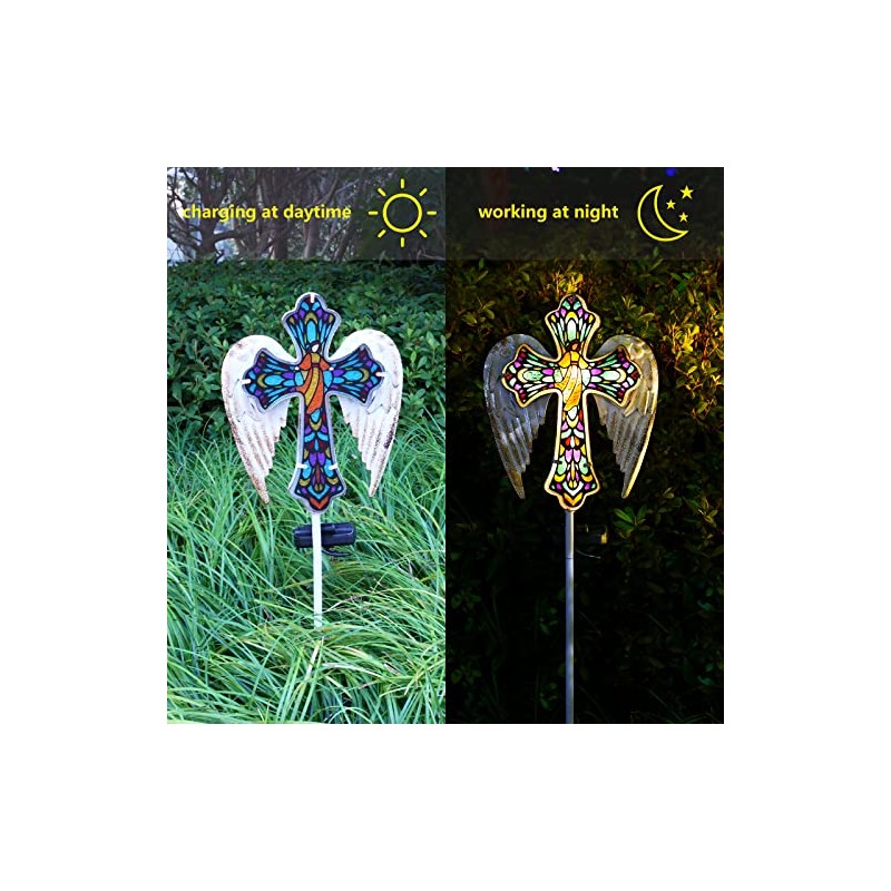 YJFWAL Solar Glass Cross Garden Stake Light, Cemetery Decorations for Grave Outdoor Lights, Jesus Cross Angel Wings Sympathy Memorial Gifts, for Garden Lawn Yard Patio Decor