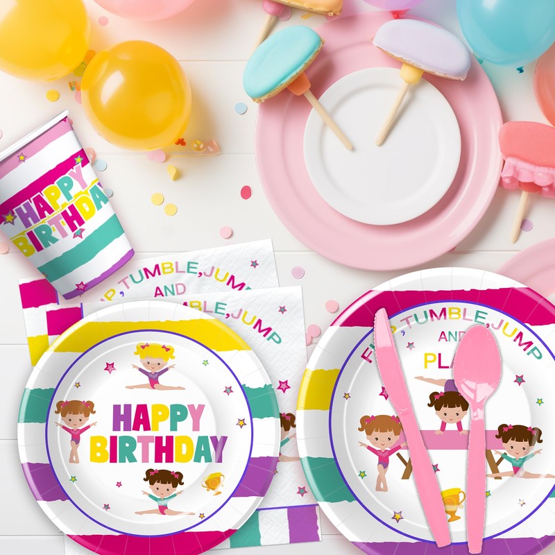 Make your celebration unforgettable with our gymnastics birthday party plates and napkins dinnerware. The charming and playful design will surely bring your guests joy and make your party memorable