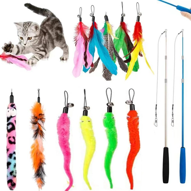 - Package Contents: Interactive cat toy kit include 2 flexible wands and 11 PCS teaser baits(feathers, worms). Cats teaser toy with bell will can increase cats interest, unique style and vivid design for your pets