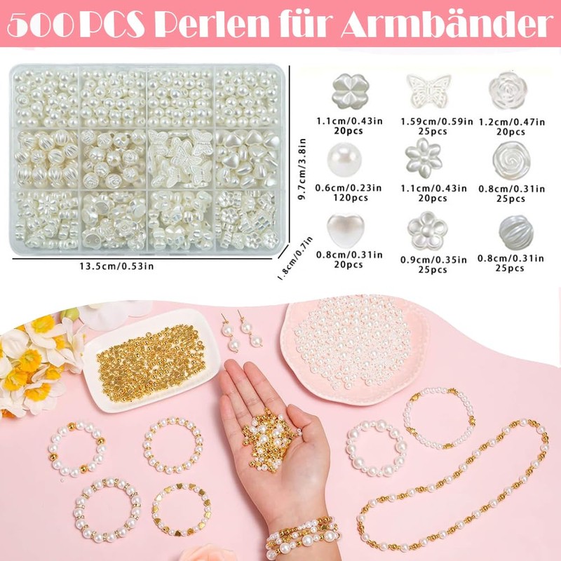 - White beads for threading: the bead set contains 6 mm imitation beads and 8 special shapes of beads, plus gold separating beads, stars, heart pendants, earring pins and ear hook pendants, as well as carabiner hooks, split rings, scissors, rubber bands and other accessories, so you can make your favorite gifts