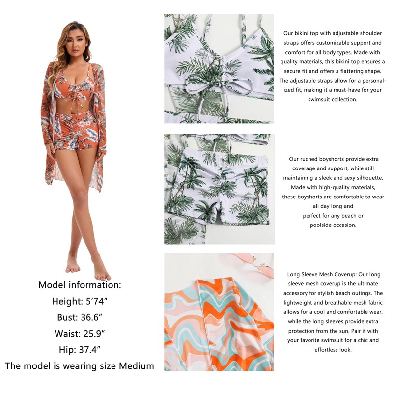 - 3 Pack Bathing Suits With Shorts: Push Up Bikini With V Neck Design And Adjustable Thin Straps To Better Fit The Bust. Front Drawsting Can Be Tied Or Untied. The Kimono Beach Sarong Coverups With Long Sleeves Are Soft And Lightweight, a Great Addition To Your Beach Gear.