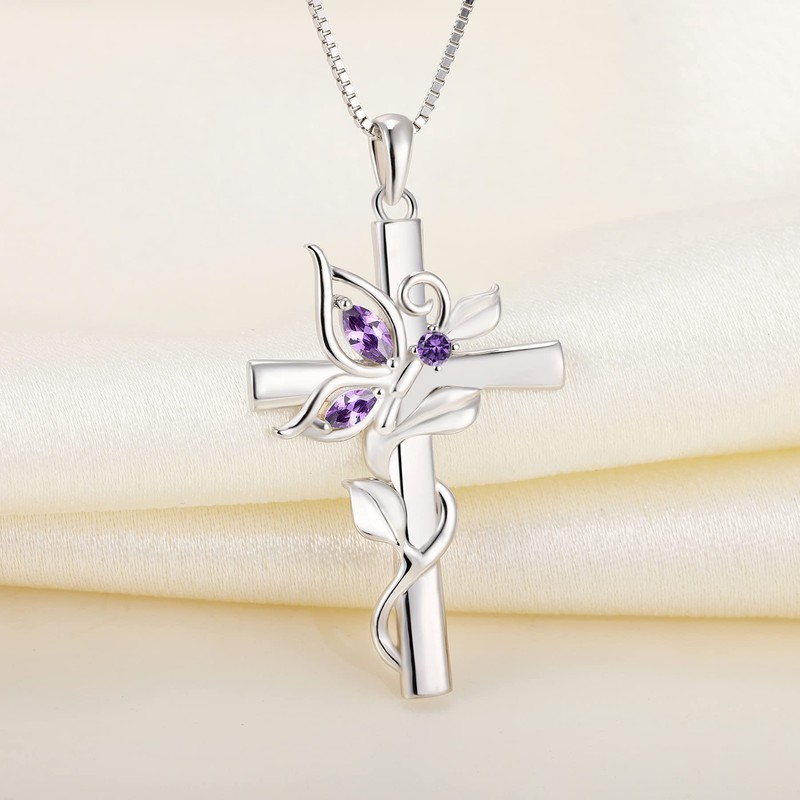 YL Butterfly Cross Necklace Sterling Silver Cubic Zirconia Leaves Pendant Created Amethyst Crucifix Jewelry for Women