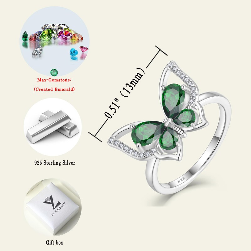 YL Butterfly Rings 925 Sterling Silver Simple Ring Created Emerald Statement Rings for Women-size10