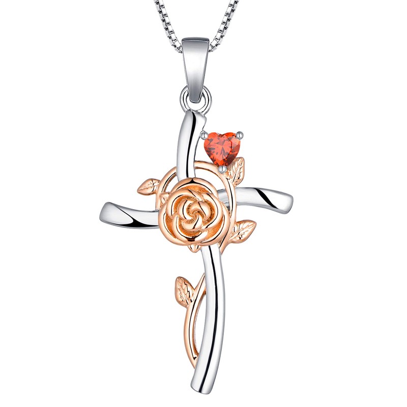 YL Cross Necklace 925 Sterling Silver Flower Rose Crucifix Pendant Created Garnet Criss Jewelry for Women