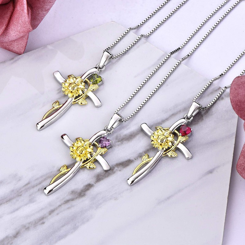 This sunflower cross necklace is made of the finest 925 sterling silver with white gold and gold plated. It is designed to prevent tarnishing. Setting with 12 birthstone - 5A zirconia.