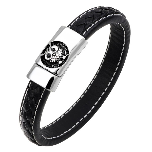 YL Mens Owl Leather Bracelet Stainless Steel Braided Bracelet Vintage Black Bangle Wristband Jewelry