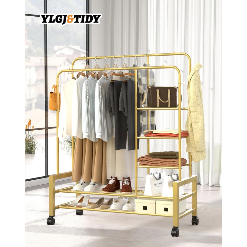 YLGJ& TIDY Expanded Capacity Clothes Rack, Clothing Racks for Hanging Clothes with Double Rods, More Storage Shelves and Hooks, Rolling Rack for Clothes, Heavy Duty Garment Rack Golden (YLYMJG01)