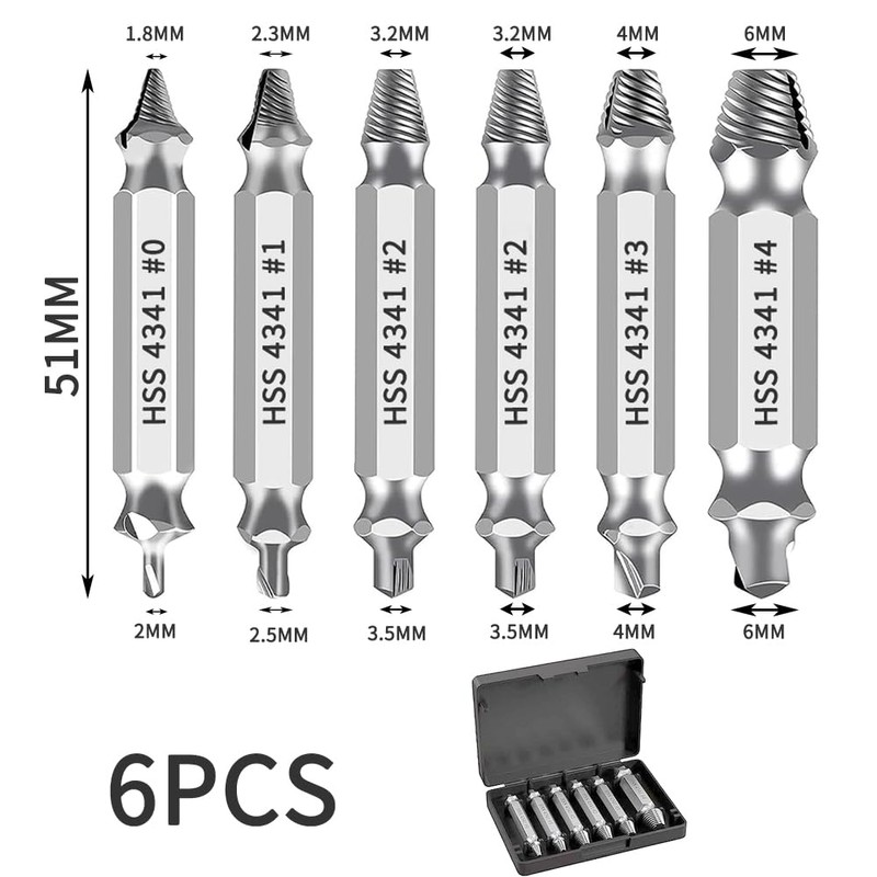 1. A screw remover consists of 6 extractors. The screw extractor set is available in 5 sizes (#0/#1/#2/#2/#3/#4), there are 2 size #2 screw extractors for different requirements. When using, you should choose the appropriate extractor according to the size of the screw.