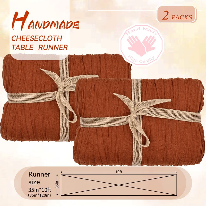 • 🍂【2 PACKS Included, Size & Color】- You will get 2 PACKS Rust color cotton and linen gauze tablecloth runner, with wrinkled, approx.35" wide and 10 ft length.Our fall table runners are 120 inches long and perfect for both rectangular and round tables or other shaped tables.And They are the perfect decoration for wedding arches or tables, chair belts, curtains, fireplaces, cabinets, sofas, etc.
