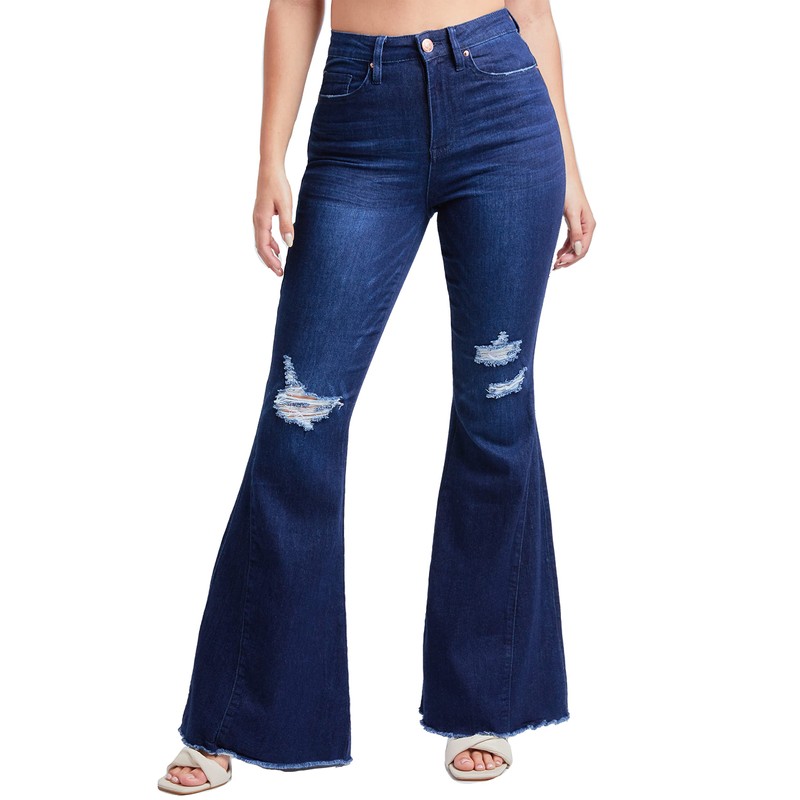 - Talk about booty for days! Designed with a super high-rise, single-button closure with front zip, classic five pocket construction, a super trendy flared fit with unfinished hem, and belt loops.