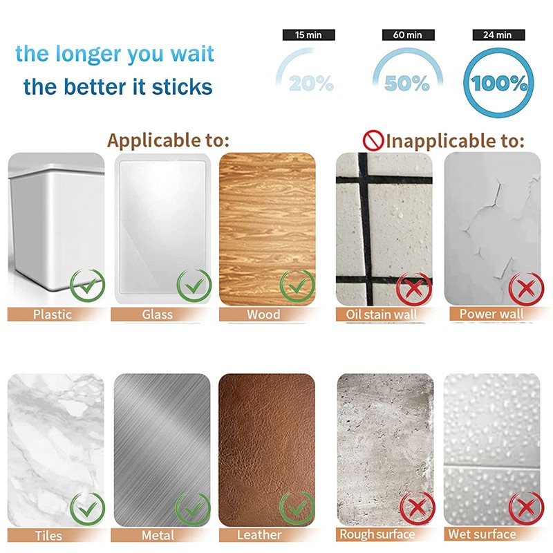- 【STRONG DOUBLE STICK TAPE】 - bonds to a wide variety of smooth and clean surfaces such as glass, metal, plastic, tile, wood, marble and more! Not suggested for wallpaper, fabrics, textured walls, brick, and other rough or non-stick surfaces.