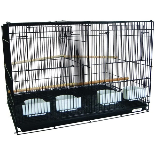 1/2" bar spacing small breeding cages with divider in Black. The cage comes with 2 lift up front doors, 1 wire divider, 4 perches, 4 feeder cups (may be in clear or white), 4 feeder doors, pull out plastic tray for easy cleaning. Cage dimension is 30L"x18"Dx18"H.