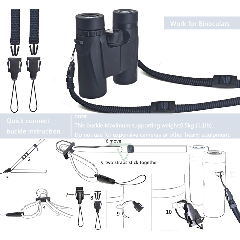 - Quick release syetem:work for compact binoculars/kids camea,Other phone cases/pad cover with two holes.unsuitable for expensive camera.unsuitable for a heavy DSLR or Bridge .