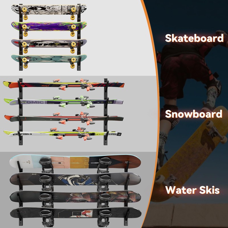 - 【Versatile Skateboard Rack】Due to you can put the racks at whatever distance, this rack can be used not only as a snowboard wall mount, but also as a longboard wall mount, a water skis rack, etc. And you can install it in your living room, hallway, garage or anywhere you need