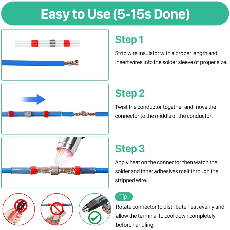 - Easy And Fast Process: solderless, crimpless, Solder seal wire connectors can be connected with just a heat gun, Simply strip your wires, insert into the solder sleeve and apply heat, Soldered butt connections are made in seconds