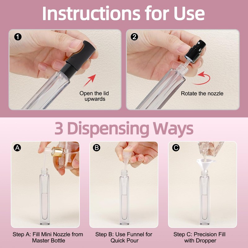 - Effortless Refill Kit – Includes a funnel, dropper, and pump insert to transform any scent into a refillable perfume bottle travel essential. Refill without mess and reuse infinitely, reducing waste and saving you money.