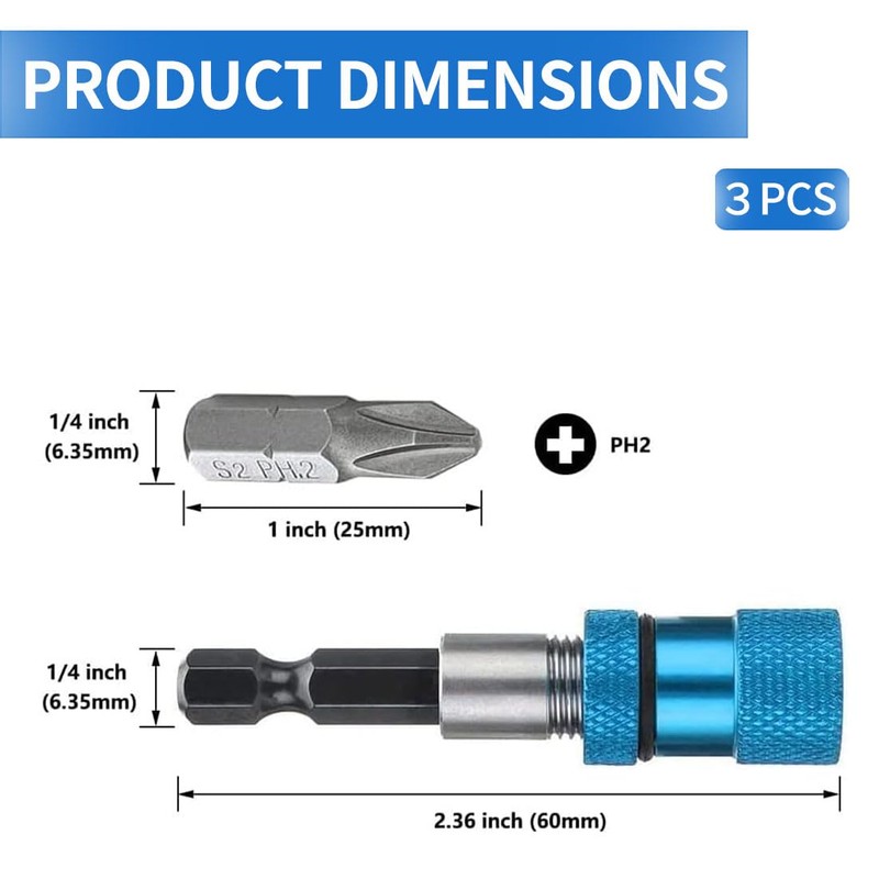 - Screwdriver bit holder: 3 magnetic bit holders with 3 PH2 cross bit bits, you can easily replace them during use or if necessary. Hex Handle: 1/4"; Interface: 1/4"