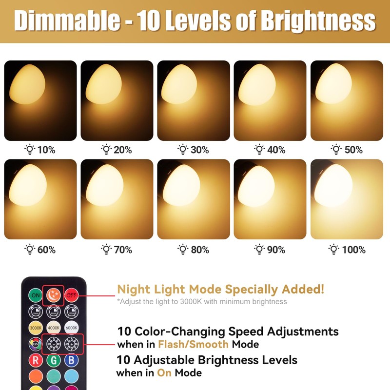 These battery operated light bulbs are designed with 9 RGB colors and 3 color temperatures(3000K Warm White, 4000K Natural White, 6000K Cool White) in one as well as 10 dimmable brightness grades from 10-100%. With this upgraded version, you can unlock your special light effects and create different atmospheres you favor.