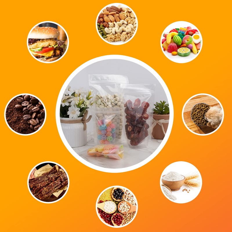 - Wide range of applications: self-supporting plastic bags are perfect to store well dried food, tea, coffee pods, salts, candy, candy, candy, nuts, seeds, beans, sugar.
