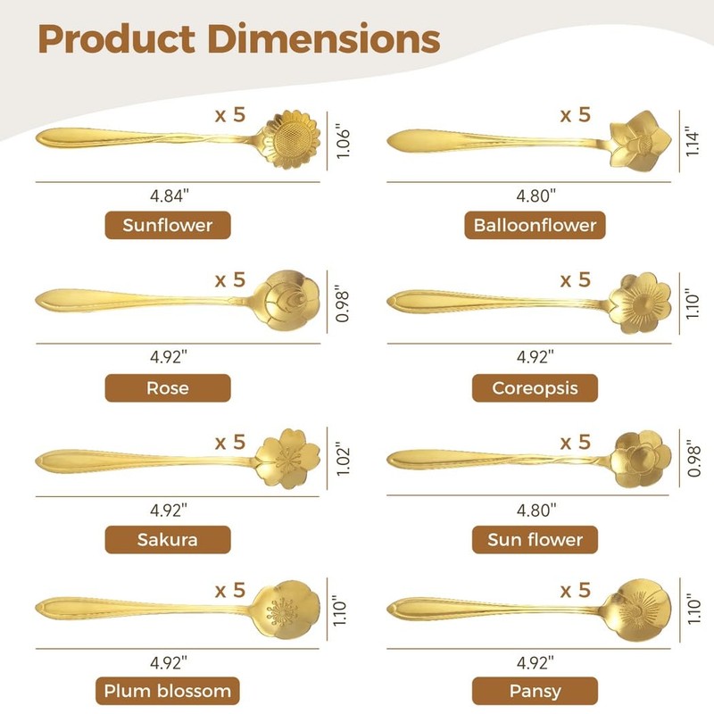- 【Abundant 40 Spoons】Enjoy the 40 elegant gold flower dessert spoons featuring 8 charming floral designs, with 5 spoons per style. With abundant quantity and diverse styles, they meet all your daily needs and add variety to your table settings.