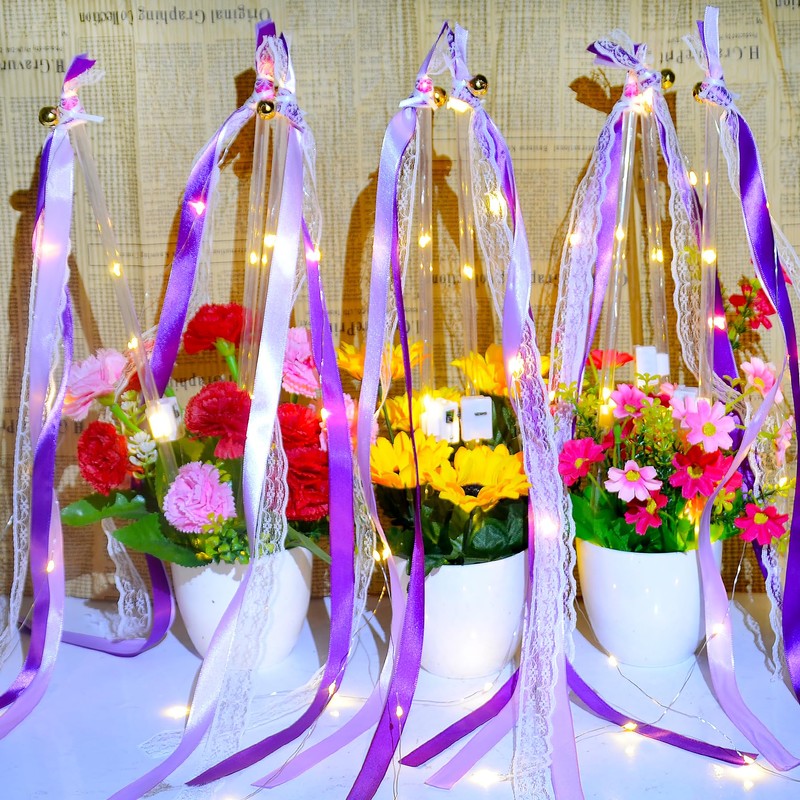 Glow wedding wands full of elegant designed,romantic wedding ribbons,elegant lace streamers and warm white led lights,easy to catch people’s attentions.Charming and clearing bell sounds add more features for your parties.