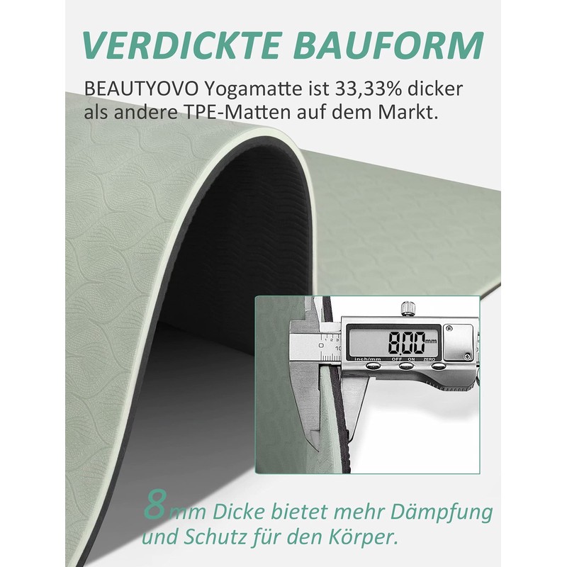 - ▨ PREMIUM ECO-FRIENDLY TPE MATERIAL - The material of a mat will determine the texture, stickiness, sponginess, and eco-friendliness. Most yoga mats are made of either plastic or rubber. BEAUTYOVO TPE yoga mat moisturizes the advantages of plastic and rubber in one, which features higher elasticity, better abrasion & tear resistance, and more eco-friendly than traditional PVC, NBR materials. It last a long time and can endure many yoga practice.