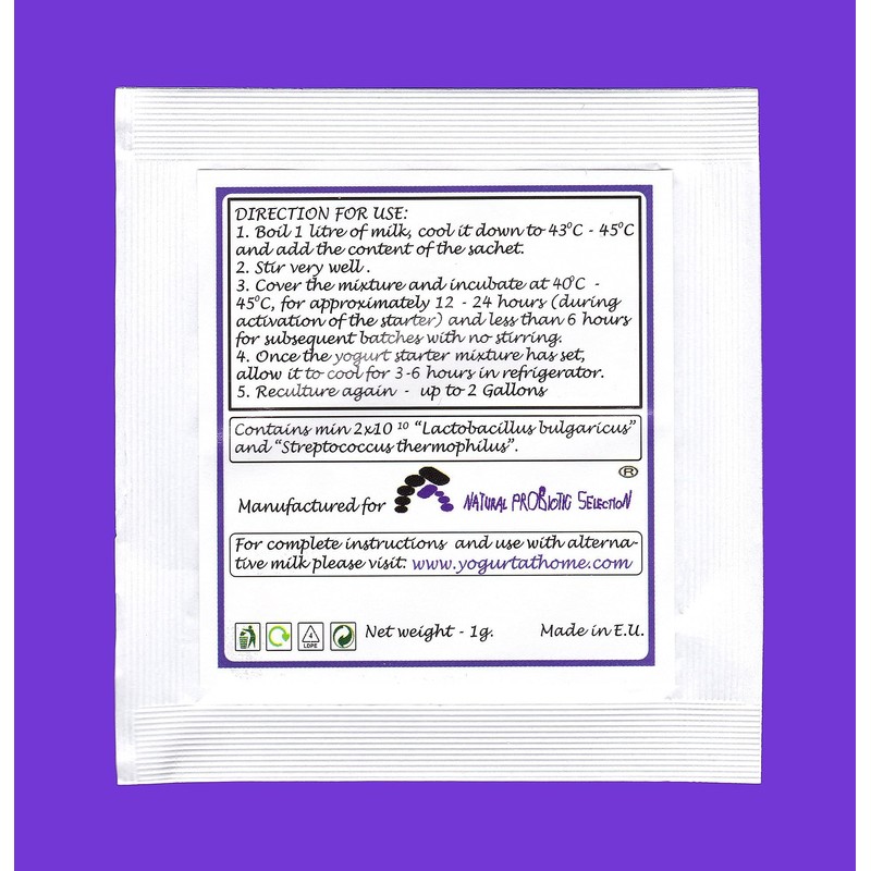 - One sachet is enough to make 1 quart of plain yogurt and re-cultured after