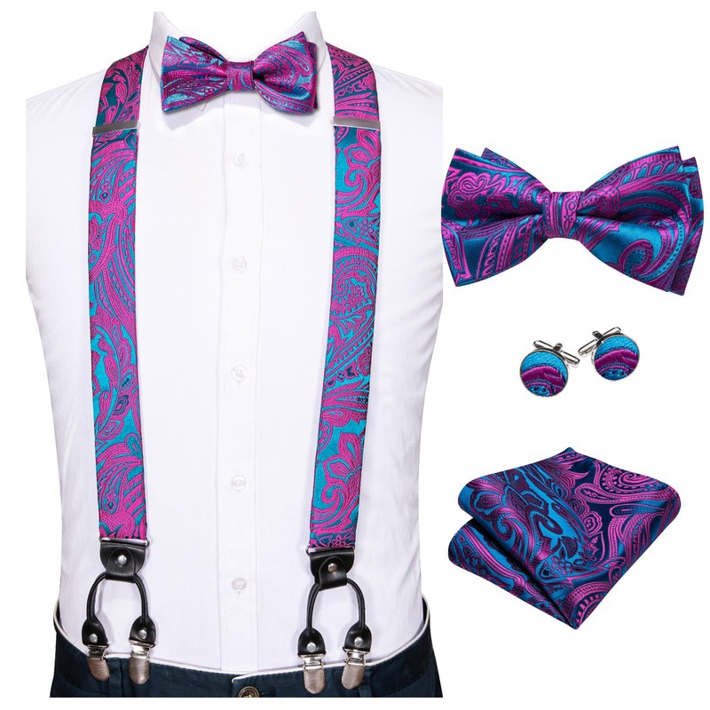 - Juego de tirantes: tirantes retro, pajarita preatada, pañuelo y gemelos, en varios colores y diferentes patrones de paisley/cuadros y rayas. Es suficiente para satisfacer tus necesidades en cualquier ocasión.