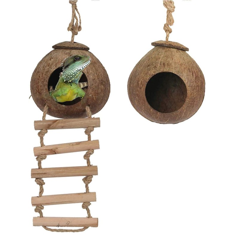 Yoicn Lth Natural Coconut Shell Gecko Nest House Reptile Hideouts Bed Cage Toy with Ladder Hanging Loop for Lizards Chameleon Gecko Snakes Small Animal 2 PCS