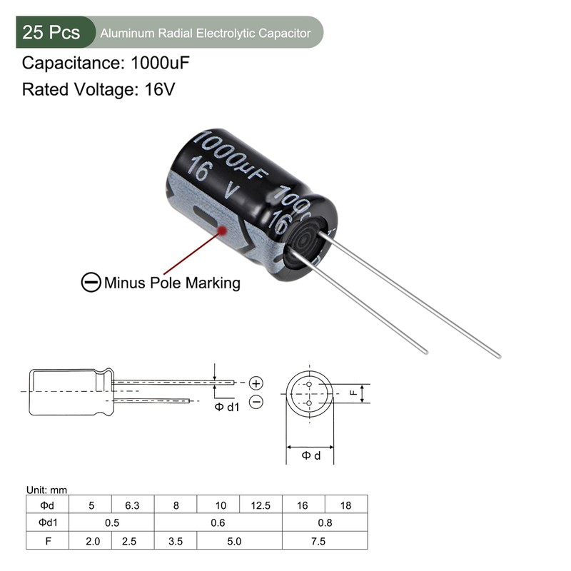 WHAT YOU GET - The package comes with 25pcs radial lead electrolytic capacitor with 10x17mm(D*L) body size: Rated Voltage: 16 Volt; Capacitance: 1000 uF; Tolerance: ±20%; Temperature Range: -40~105°C / -40~221°F.