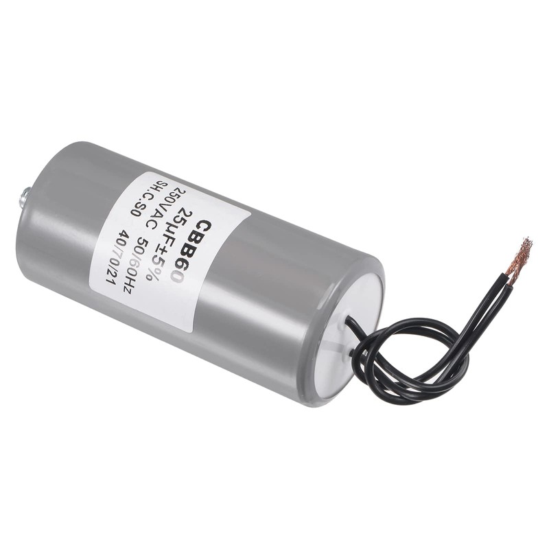 WHAT YOU GET - The package comes with 1 pcs CBB60 Run Capacitor that measure Thread: M8, Fixing Stud Length: 13mm / 0.5 inch, Wire Length: 150mm / 5.9 inch, Body Size: 98x45mm / 3.9x1.8 inch (L*D), Lead End: 2 Wires, Tolerance: ±5%, Rated Capacity: 25uF, Rated Voltage: 250V AC, Rated Frequency: 50/60Hz, Climatic Category: 40/70/21.