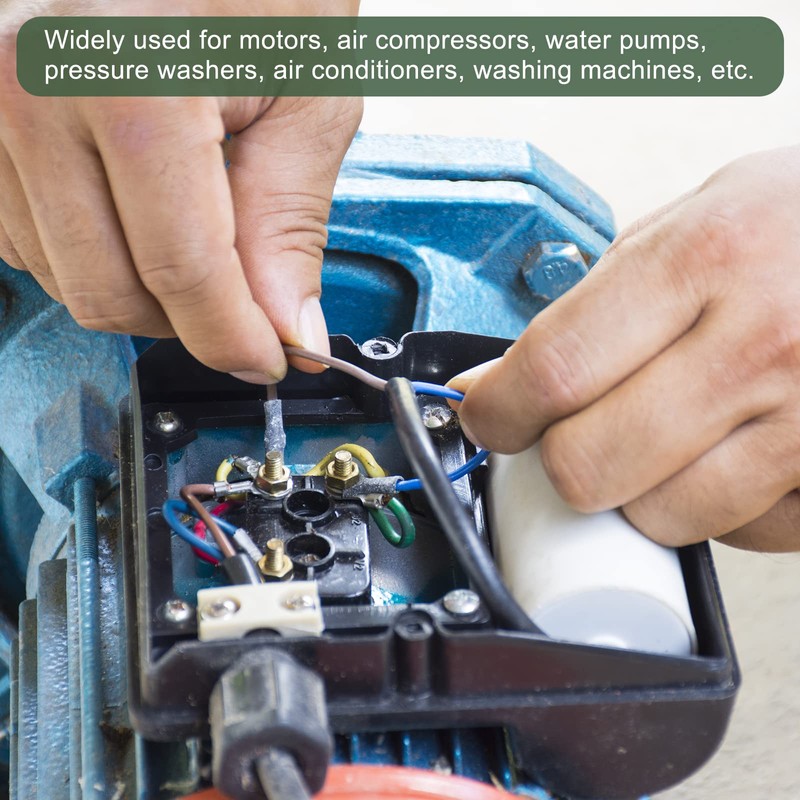 • √MULTIPURPOSE - CBB60 Run Capacitor, AC motor capacitors are good for washing machines, air conditioners, lamps and other single-phase motors with a frequency of 50HZ/60HZ AC power supply and relatively small power supply.