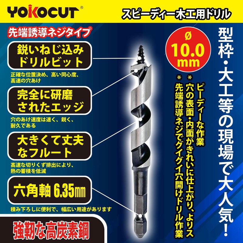 YOKOCUT Woodworking Drill Bit, 0.4 inch (10 mm), Hex Shank, Short Bit for Woodworking, Tip Induction Drill Point